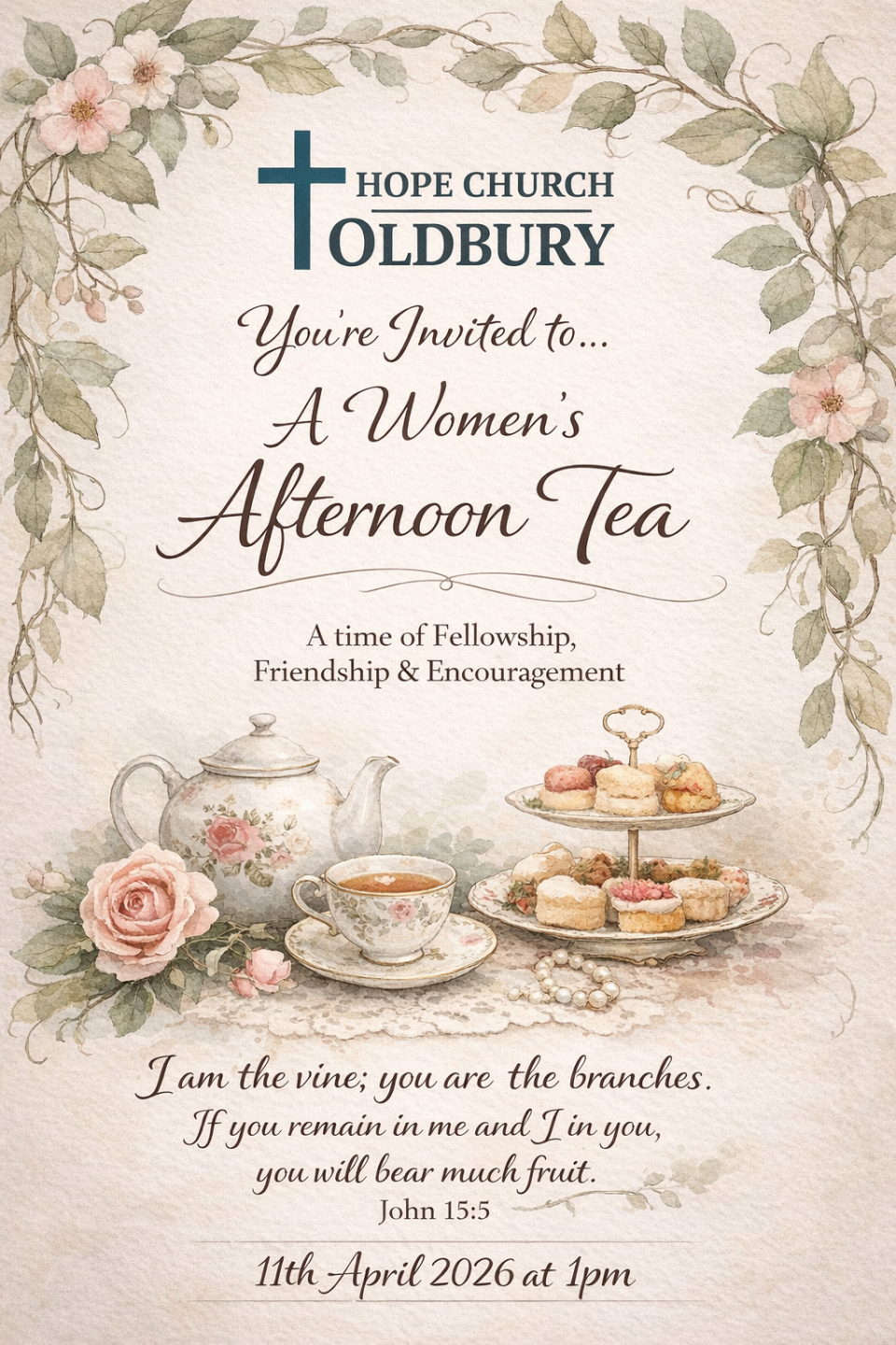 On Saturday 11th April at 1pm, we warmly invite all ladies to our Afternoon Tea, a wonderful time of fellowship, encouragement, and refreshments. This special event will be hosted by Pastor Tina Hancox